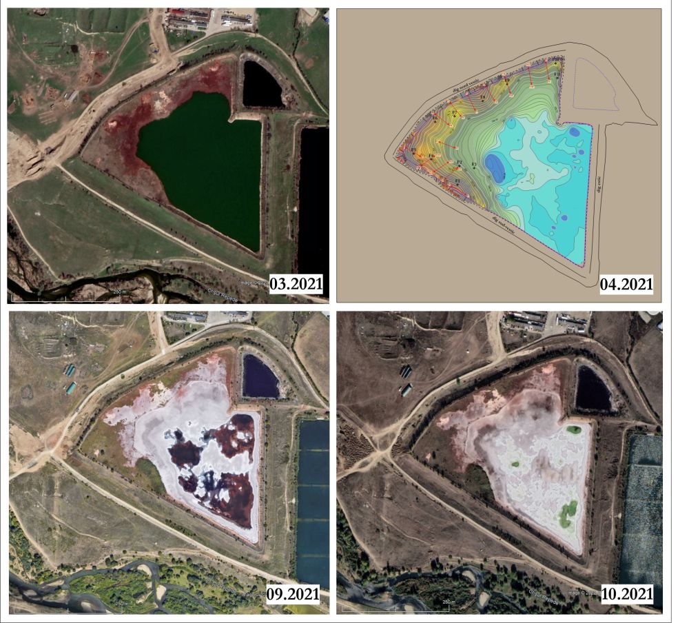 Investigatii geofizice si geologice pentru evaluarea volumelor de reziduuri lichide si solide din depozite de deseuri periculoase (exemplu: masuratori ERT, GPR si sonar ; imagini inainte, rezultatele masuratorilor si dupa evacuarea fractiei lichide);